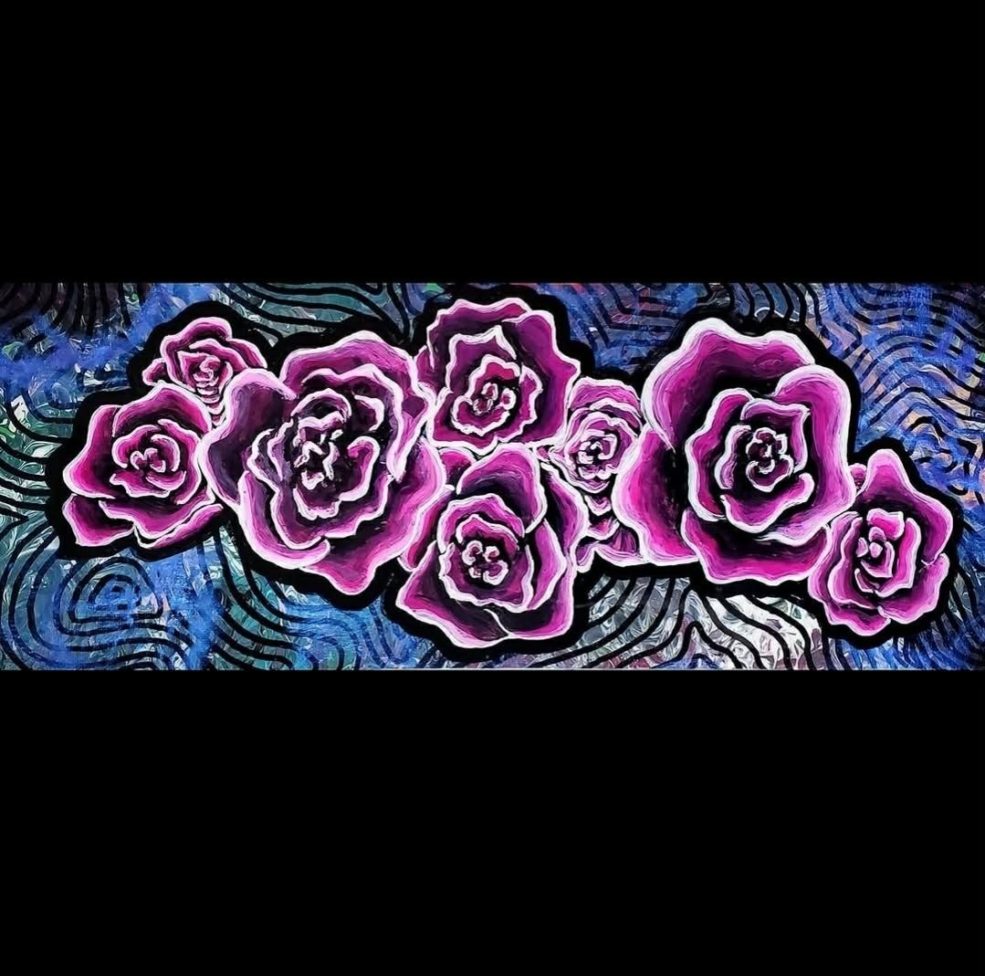 A stylized arrangement of roses forms the central focus of this layered mixed-media work. Roses appear frequently throughout my practice, reflecting the personal significance as the favorite flower of my late mother. Built through multiple applications of paint, resin, and mica powder, the composition integrates several techniques to create dimensional texture, luminous surface effects, and visual depth.