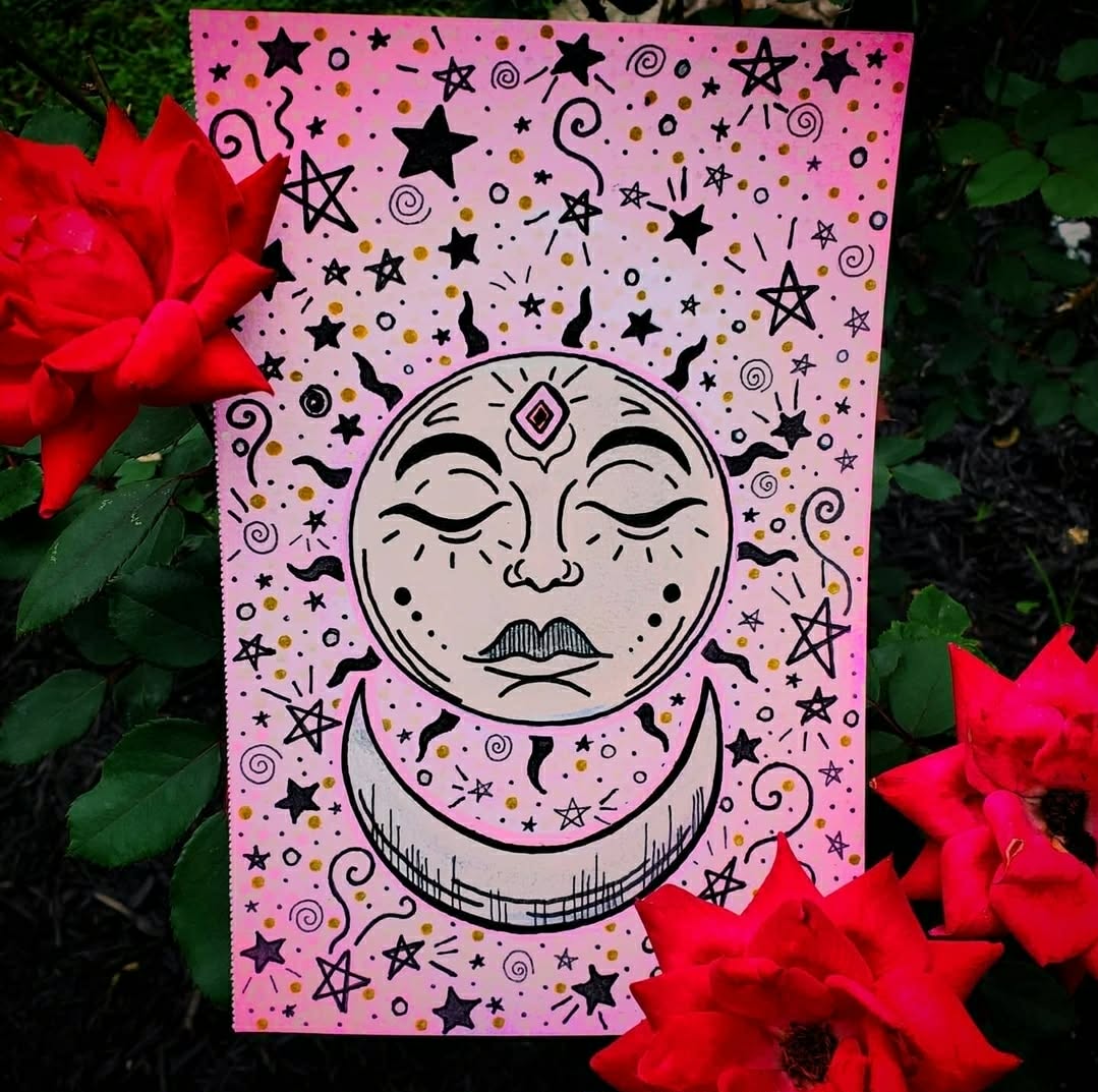 A dreamy celestial portrait exploring stillness, intuition, and emotional balance. Graphic linework and cosmic symbols contrast with a soft pastel palette, creating a sense of quiet inner energy and reflection. Influenced by mystical imagery and surreal character design, the piece invites viewers to consider cycles of rest, growth, and transformation.