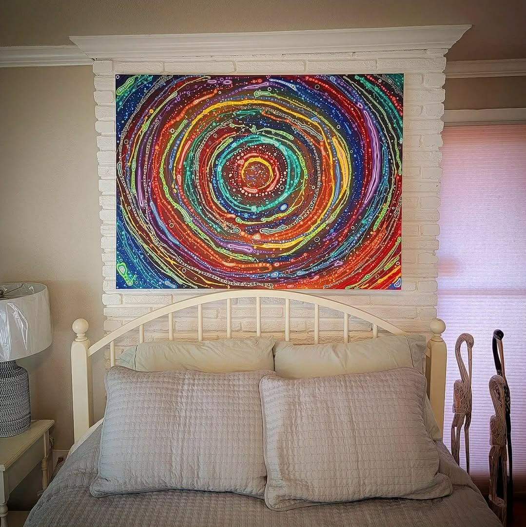 This piece features a dynamic concentric composition built through layered color, texture, and rhythmic mark-making. Radiating bands of saturated hues create a sense of depth, motion, and visual energy, drawing the viewer inward toward a luminous focal point. Influenced by contemporary abstract expression and psychedelic visual language, the work explores themes of vibration, emotional intensity, and the immersive potential of color as spatial experience.