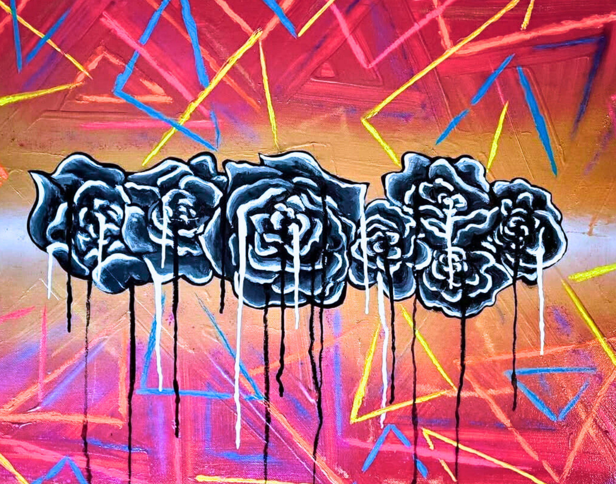 This piece juxtaposes a row of monochromatic roses against energetic abstract layers of saturated color and angular mark-making, introducing a sense of tension between control and release, softness and intensity. Continuing the recurring use of rose imagery as a personal and symbolic motif, the work explores themes of emotional contrast, memory, and resilience through the interaction of bold color, graphic form, and gestural surface.