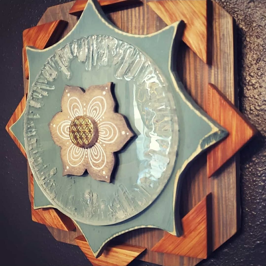 This layered sculptural wall piece draws inspiration from mandala structures and symbolic geometry, combining cut wood forms with poured resin to create dimensional depth. Embedded quartz crystals introduce natural texture and reflective variation, while a central gold sacred geometry motif serves as a visual focal point suggestive of balance and energetic alignment. The work explores the relationship between material contrast, spiritual symbolism, and the meditative qualities of repeated form in contemporary mixed-media sculpture.
