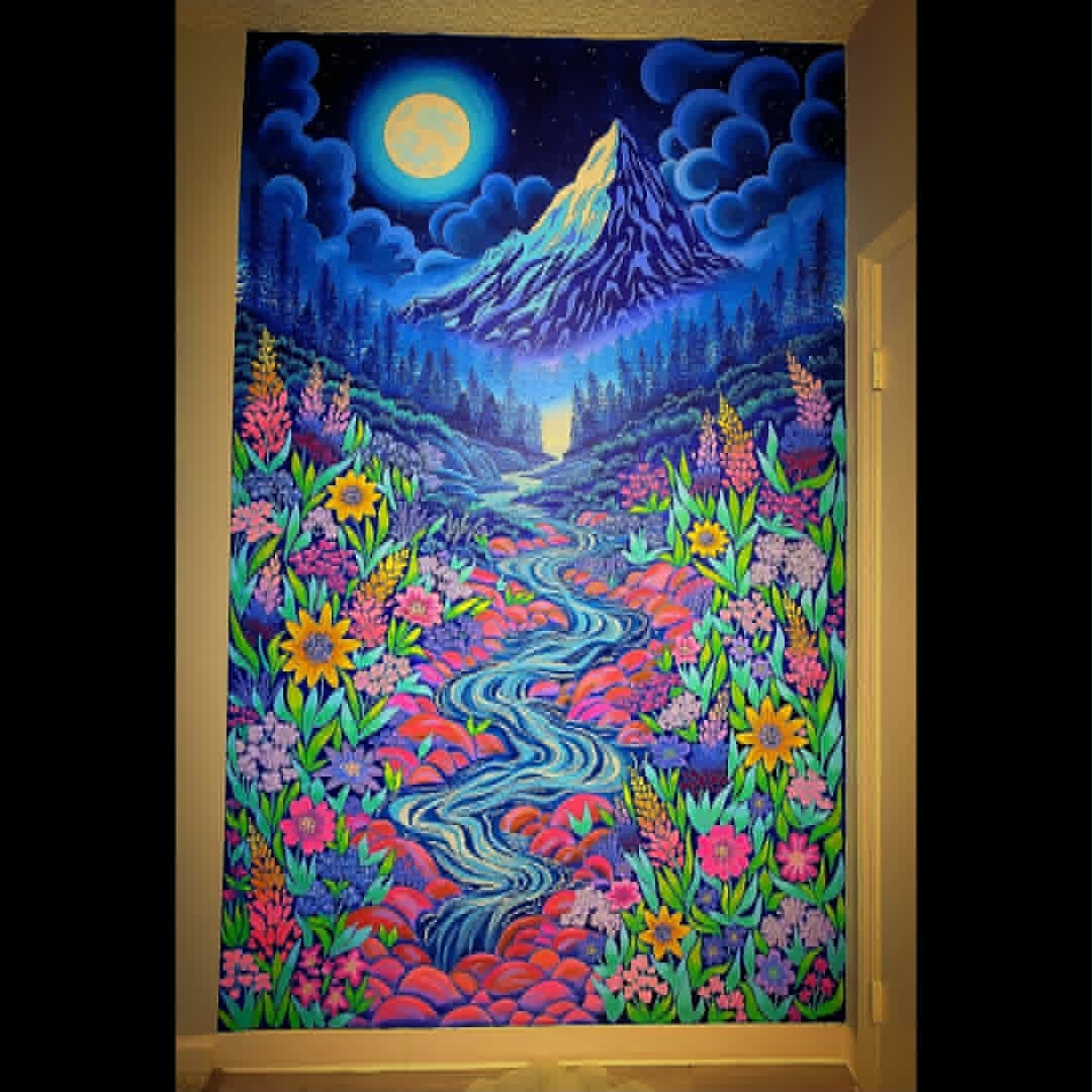 This floor-to-ceiling wall mural presents a stylized nocturnal landscape in which a winding river guides the viewer’s eye toward a luminous mountain under a full moon. Saturated color, rhythmic pattern, and layered depth create a sense of movement and atmospheric immersion. Drawing from contemporary psychedelic landscape traditions and illustrative design, the work explores themes of journey, contemplation, and the restorative power of imagined natural environments.