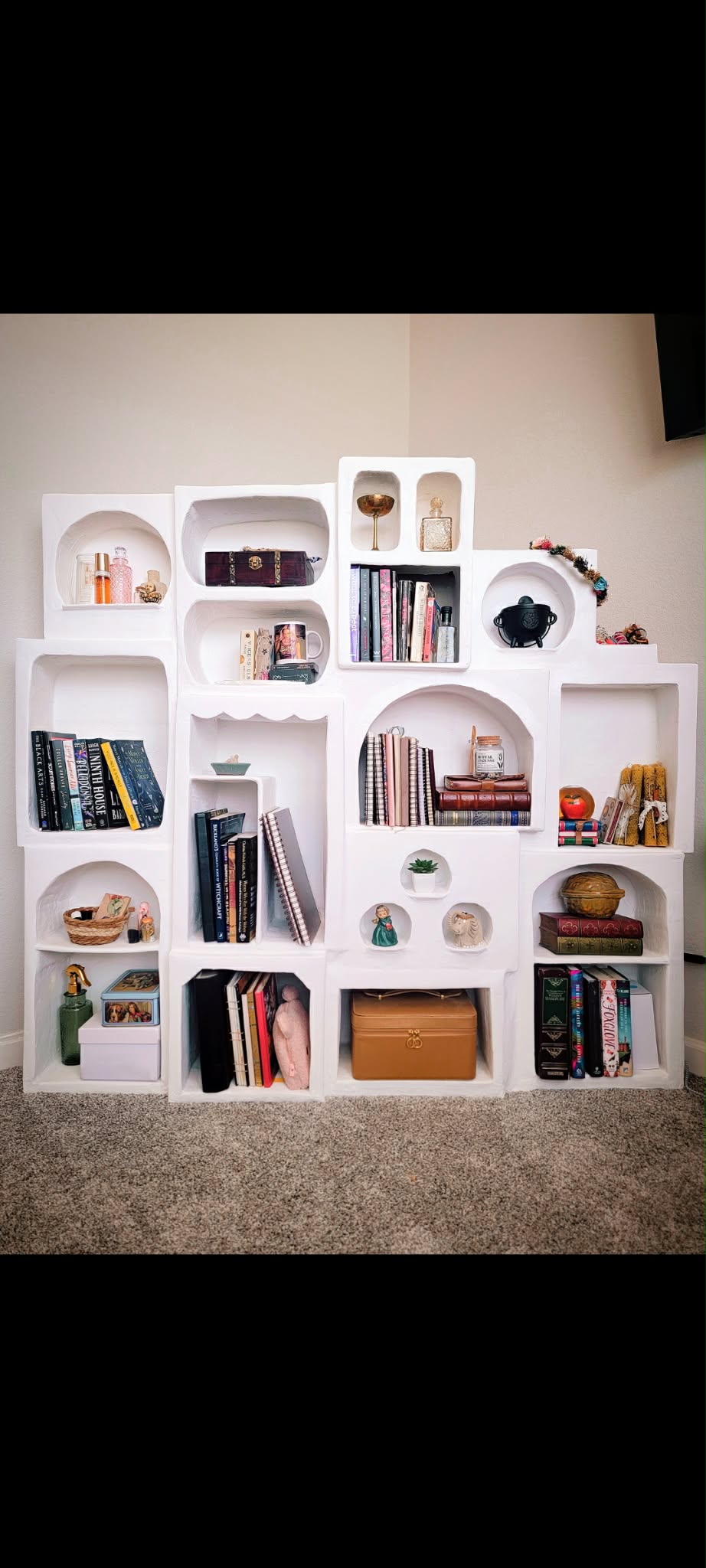 This sculptural shelving piece was constructed from repurposed cardboard and finished with layers of joint compound to create a solid, architectural surface. The design features a series of asymmetrical niches and curved openings, blending functional storage with a playful, hand-built aesthetic. By transforming humble, lightweight materials into a durable decorative structure, the work explores themes of resourcefulness, material illusion, and the creative potential of everyday objects.
