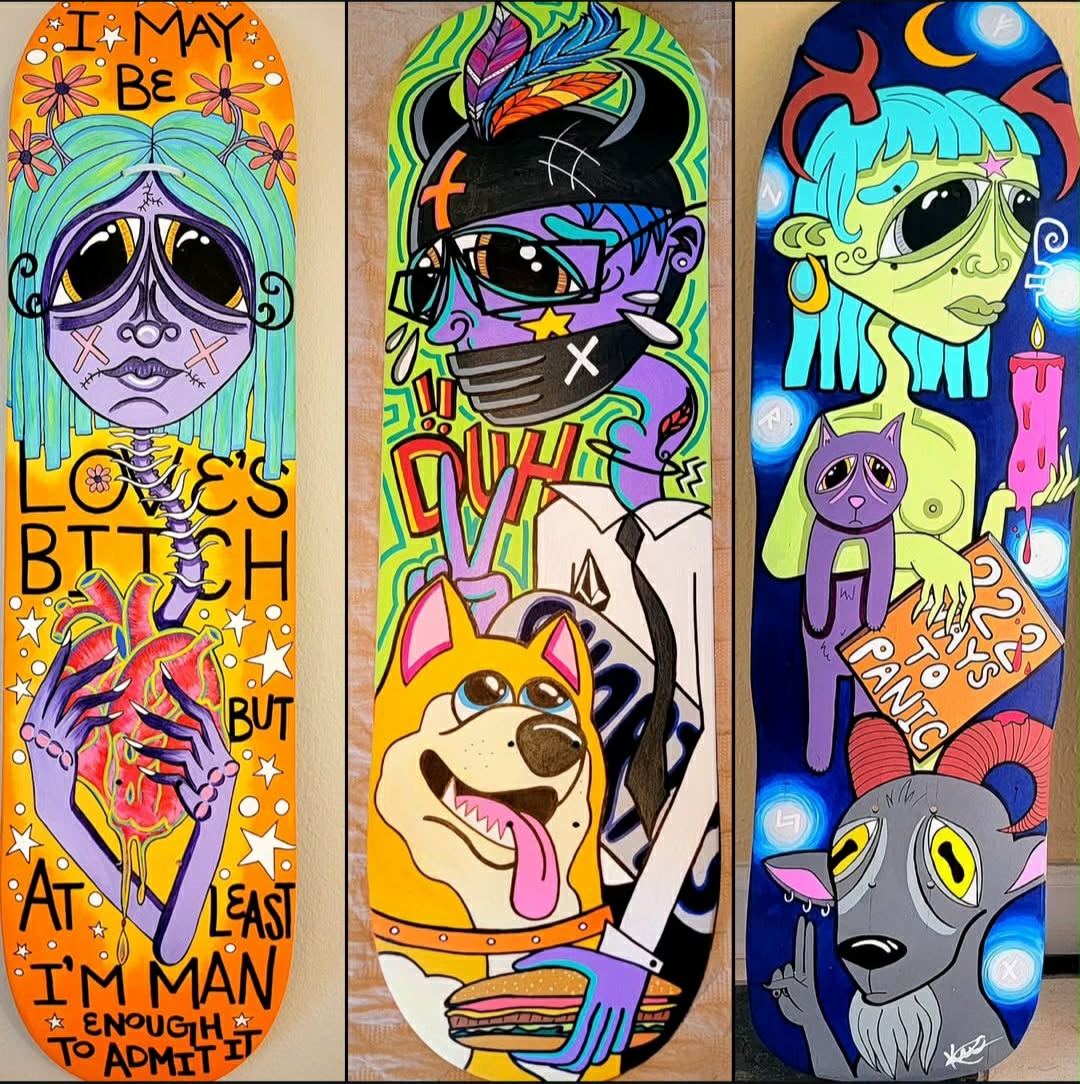 This collection of skateboard decks were influenced by elements of pop-surrealism, street art, and illustrative portraiture. Themes of vulnerability, identity, humor, and inner dialogue appear throughout the series, inviting viewers to connect with both the playful and introspective aspects of the imagery. These decks are created using acrylic paint and are intended to be experienced as standalone art pieces.